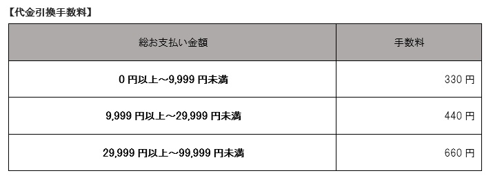 代引き手数料は総お支払金額(商品代金+送料+代金引換手数料)に応じて決まります。